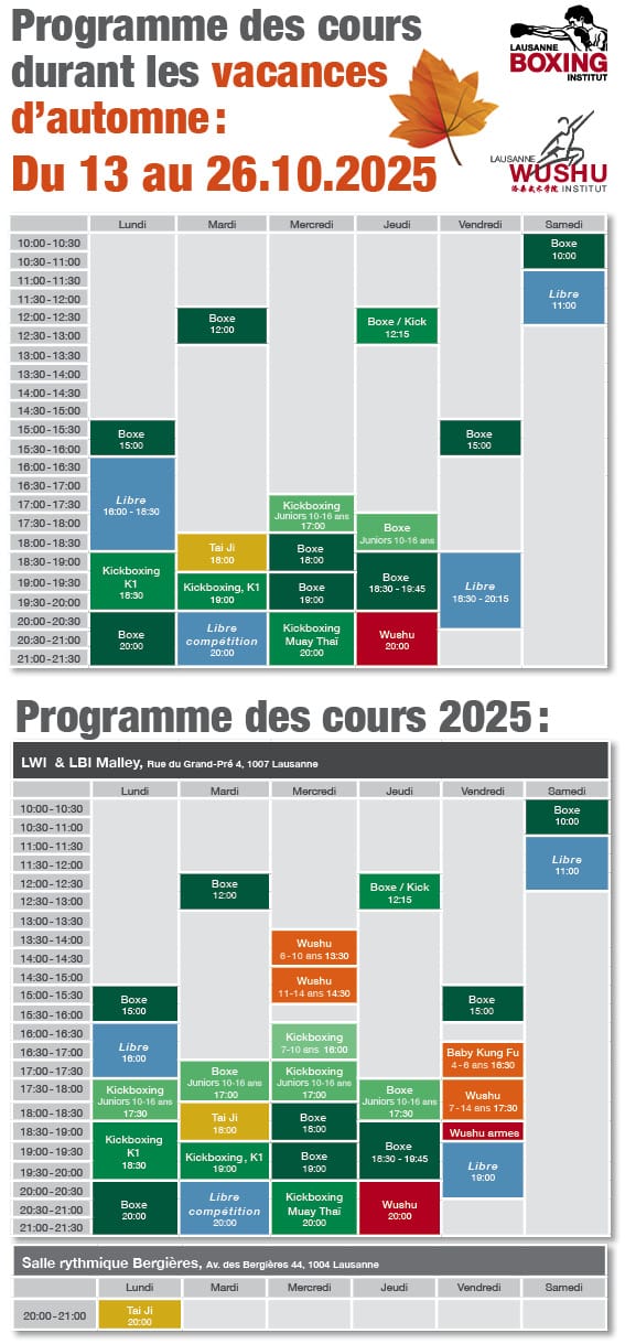 Confirmés ou débutants, rejoins le Lausanne Wushu & Boxing Institut, fondé en 2009. Centre de formation de renom, viens apprendre ou te perfectionner sous le coaching d’entraineurs titrés au niveau mondial et national. Nous t’accueillons dans une ambiance sympathique et dans un cadre sécurisé.